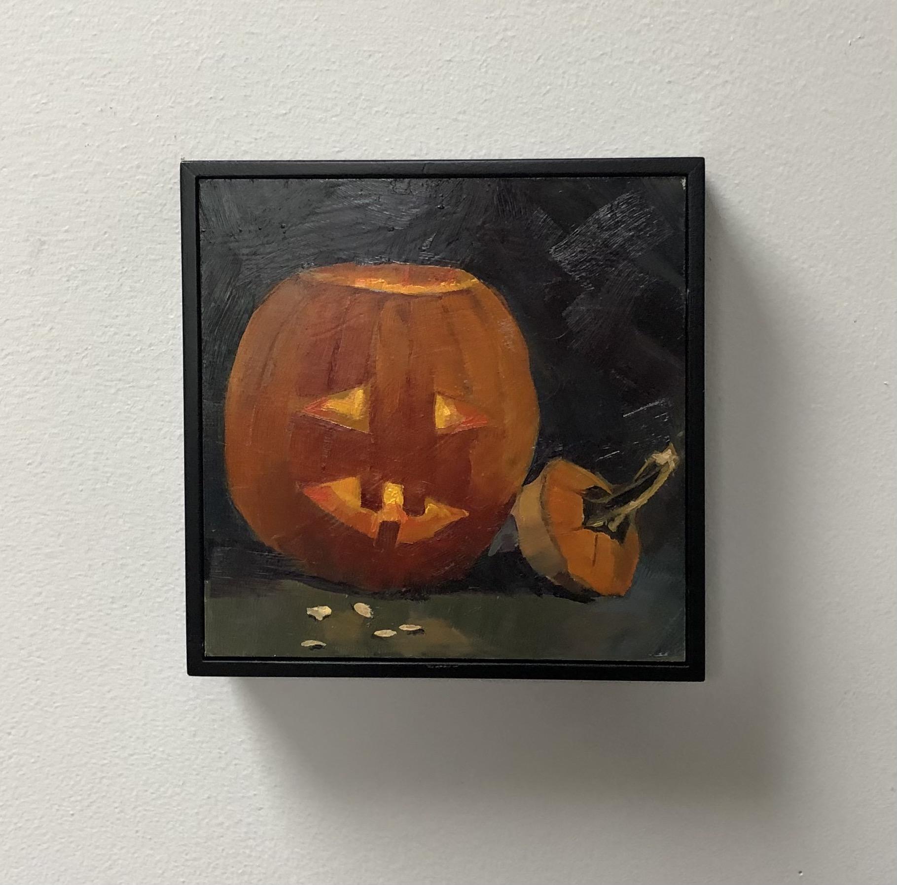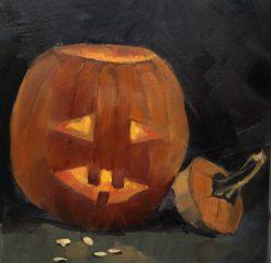 This is part three of a triptych, about this little pumpkin. The final outcome of carving a pumpkin. I didn’t give him a nose. When we were kids, I remember lighting a candle, tipping it sideways and dripping the wax into the pumpkin to have an anchor for the candle. Blow it out and stick it in the hot wax. Happy, scary, funny, creepy, pumpkin heads, they illuminate the night and welcome Trick or Treaters on Halloween.