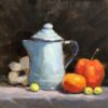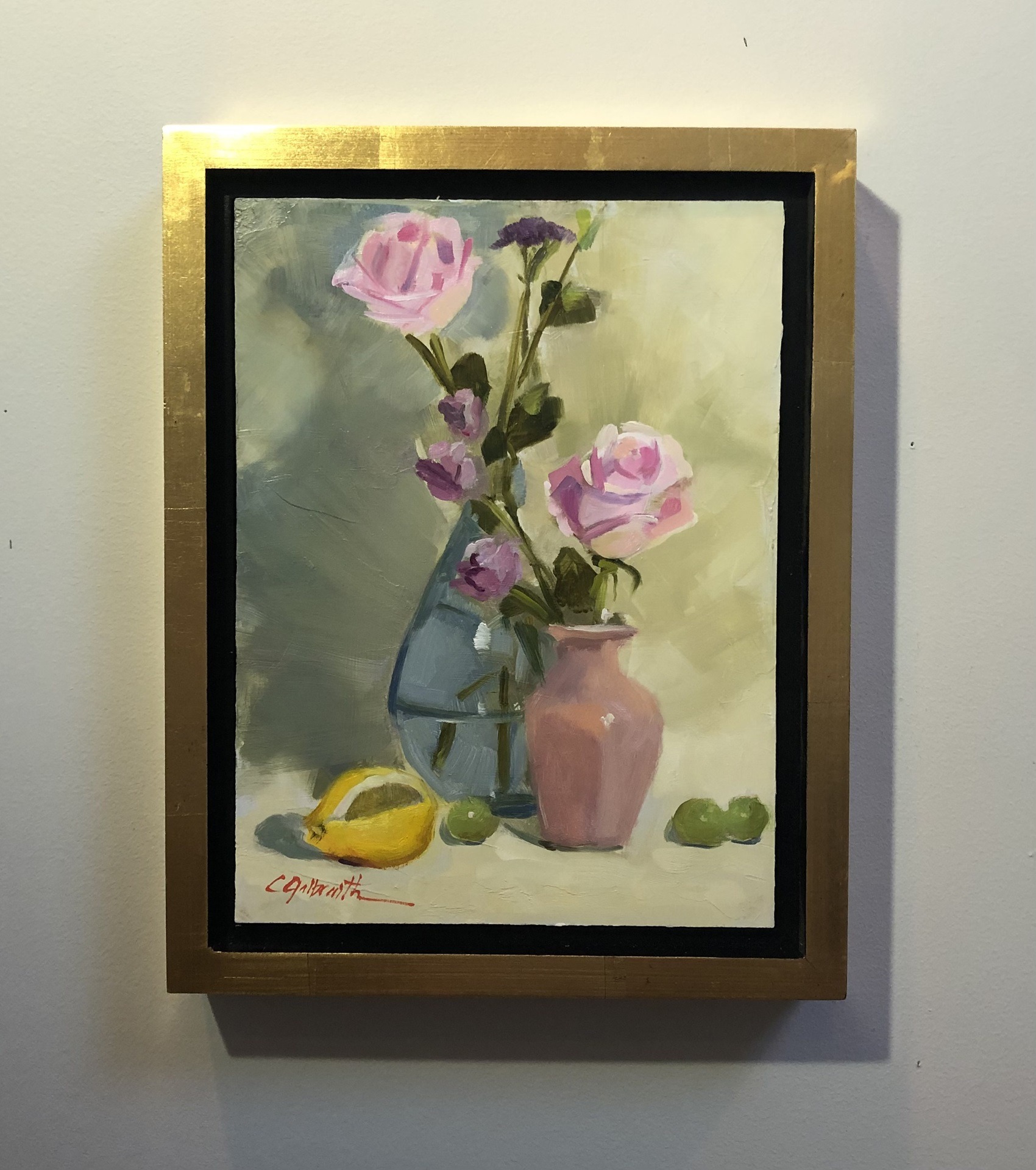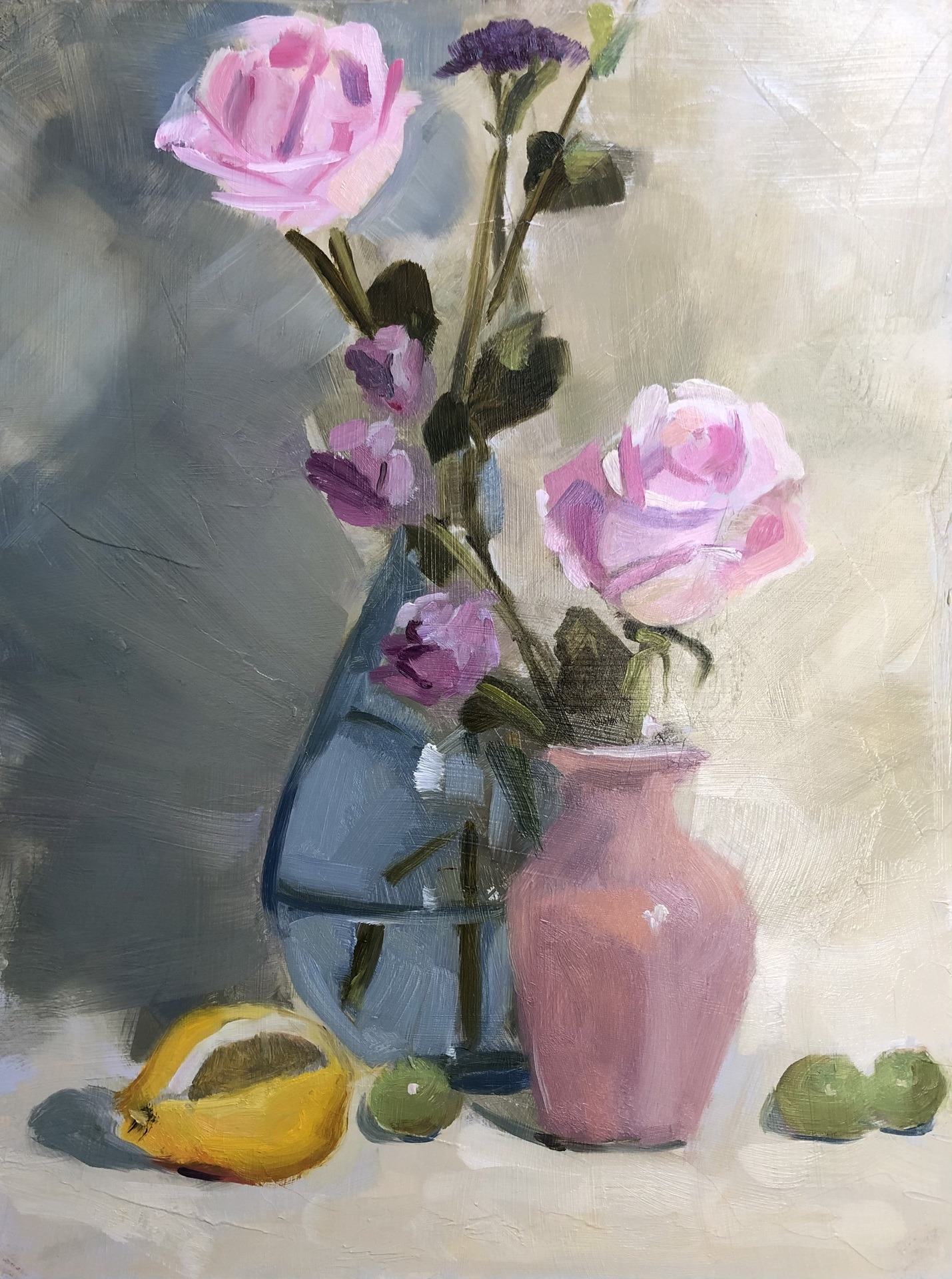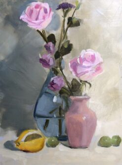A blue glass bottle sets off these pink roses. But needing a little something extra I added some grapes and a lemon.